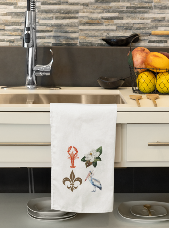 Natural color kitchen towel featuring iconic Crawfish, Magolia, Pelican and Fleur-de-lis. The towel also comes with 4 coasters, each coaster has one of the following designs, Crawfish, Magnolia, Pelican and Fleur-de-lis matching the towel. The towel is 100% Cotton.