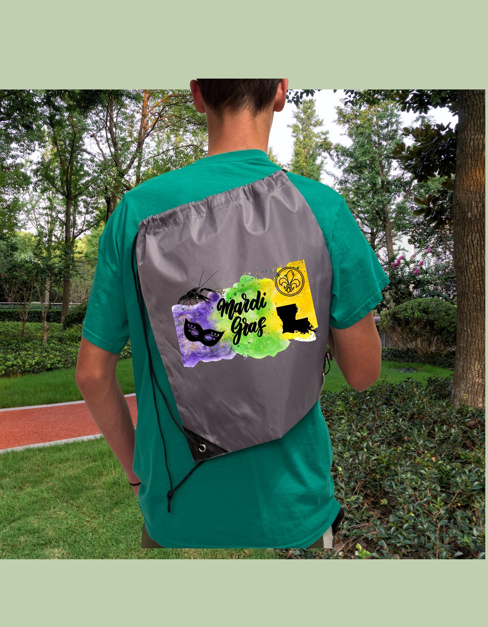 Light Gray drawstring bag with 8in "Mardi Gras" with Crawfish, Doubloon, Mask and Louisiana.