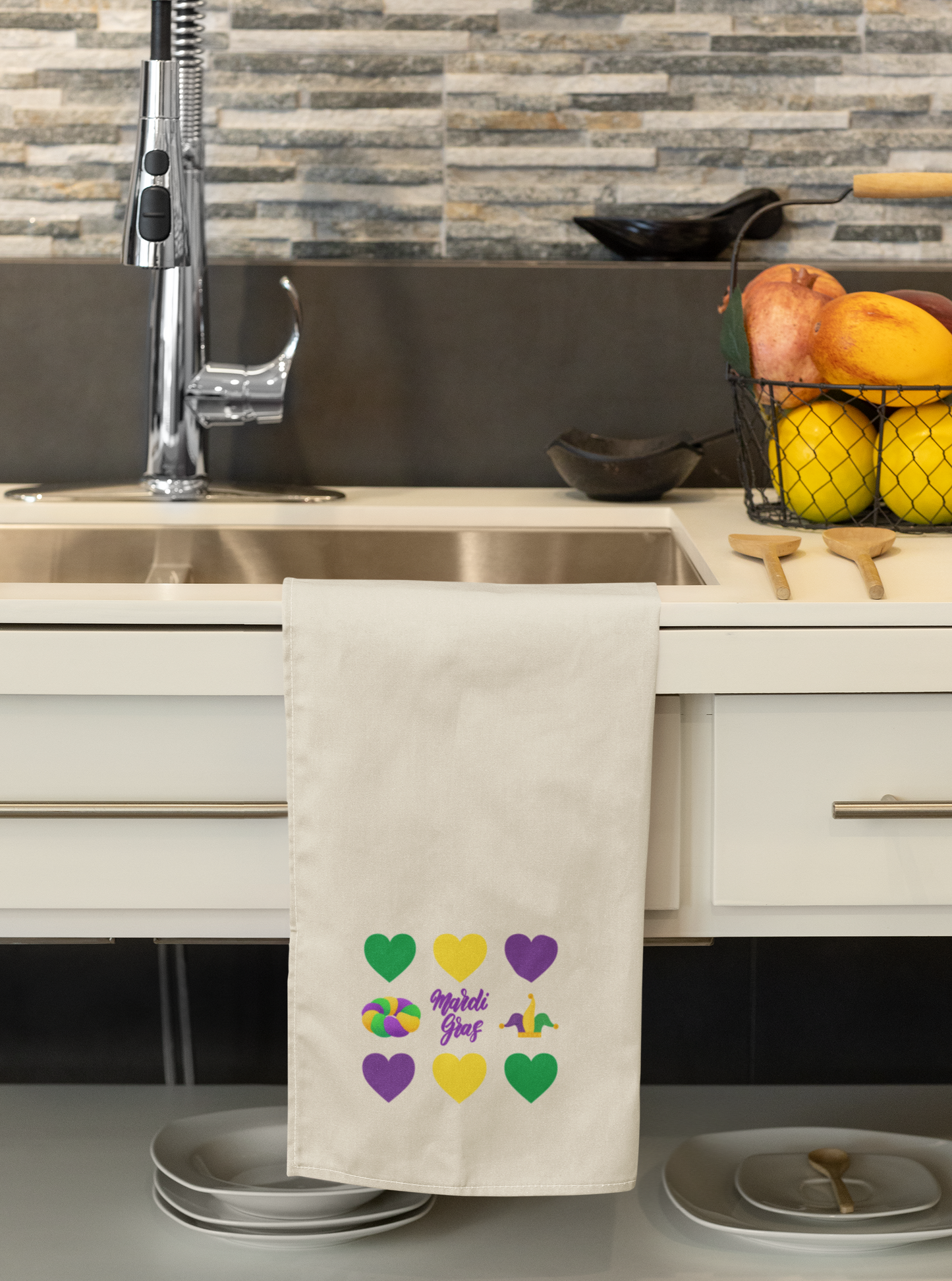 Natural color kitchen towel with Purple, Green & Gold Mardi Gras Hearts, King Cake & Jester Hat 3x3. The towel is 100% Cotton.