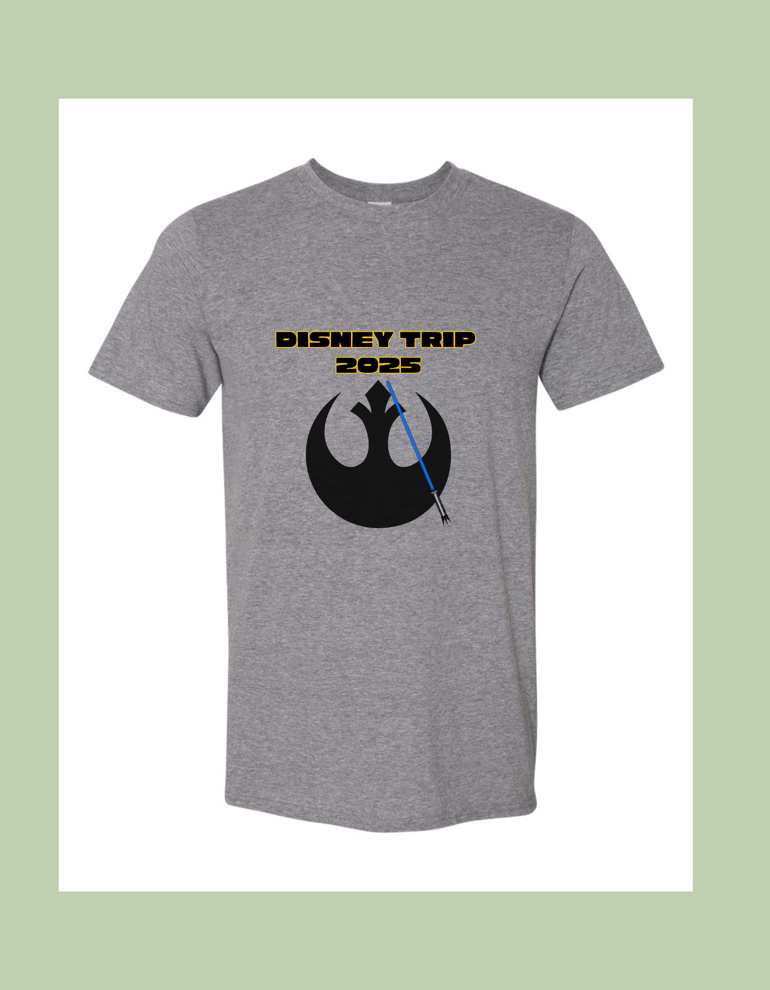 "Disney Trip" with Year design on grey Gilden Softstyle 100% cotton t-shirt.