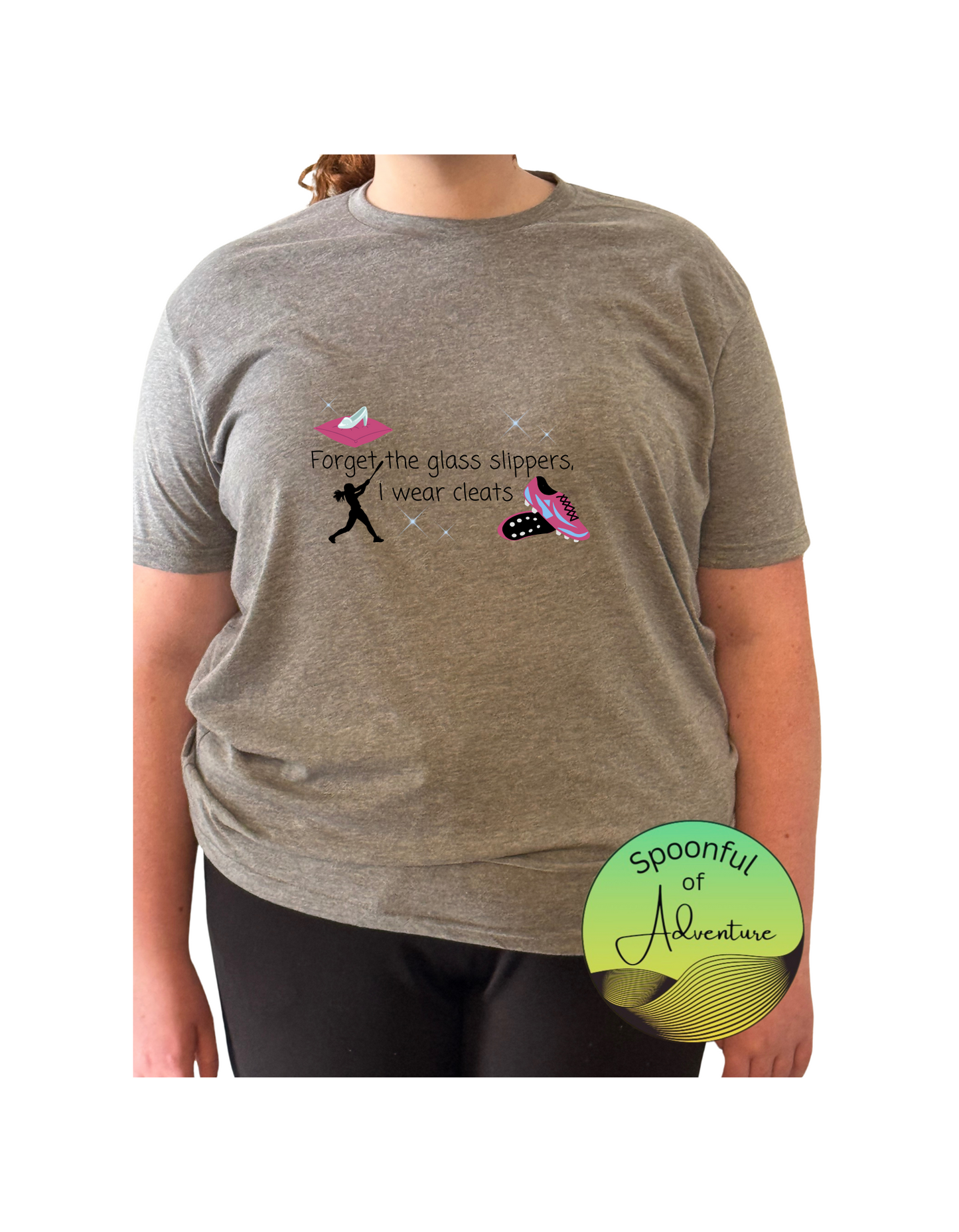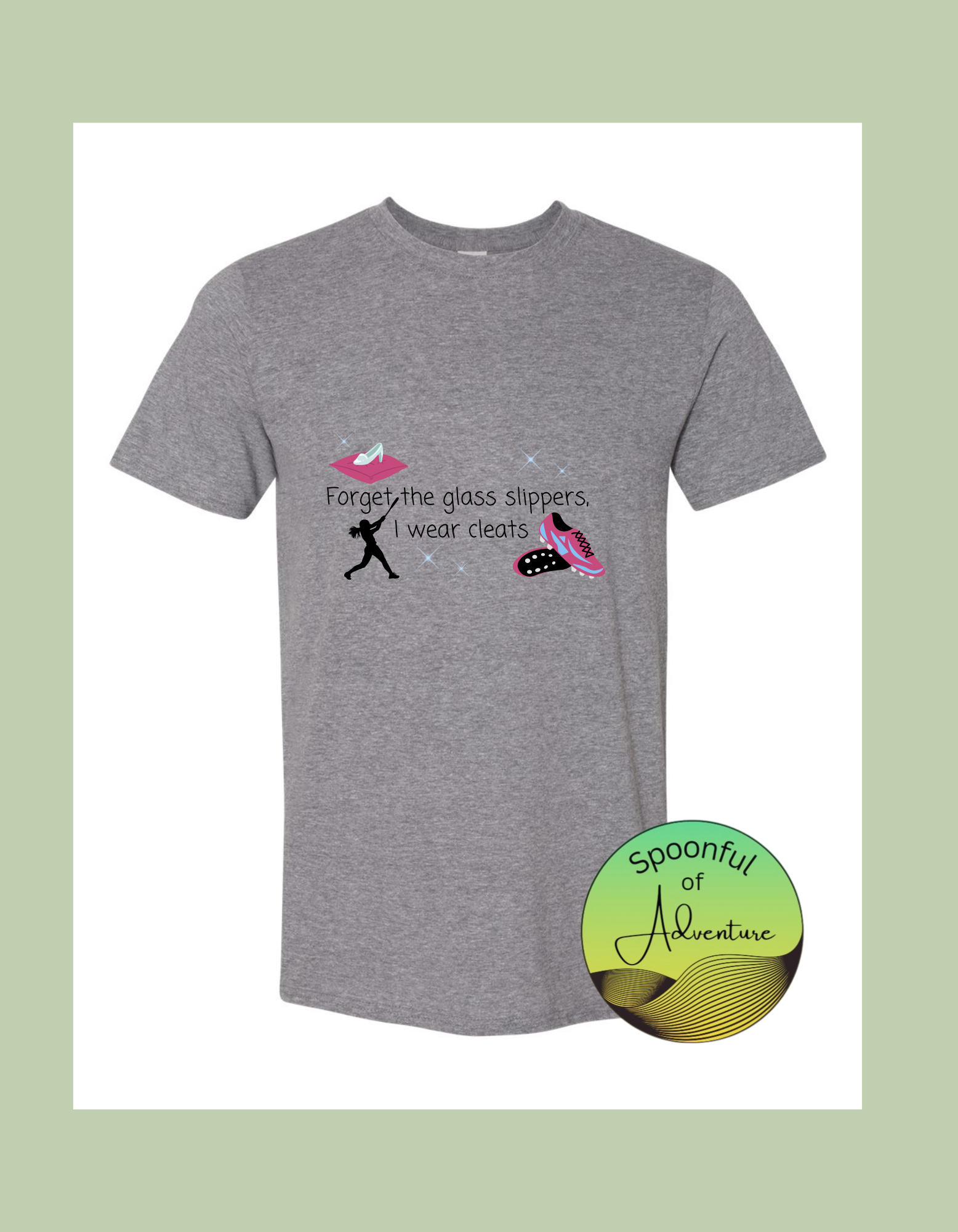 "Forget the glass slippers I wear cleats" design on grey Gilden Softstyle 100% cotton t-shirt.