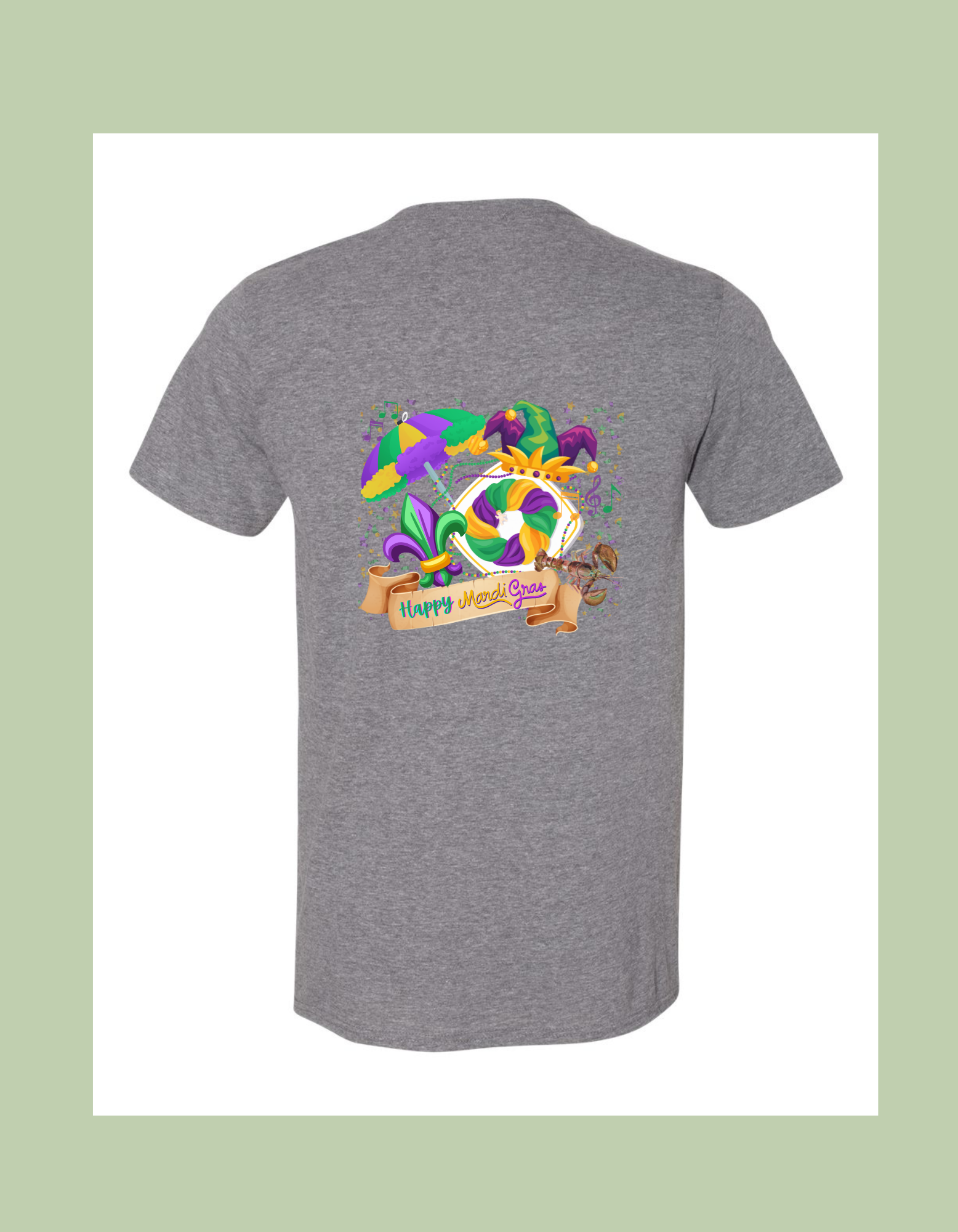 "Happy Mardi Gras" design on back of grey Gilden Softstyle 100% cotton t-shirt.