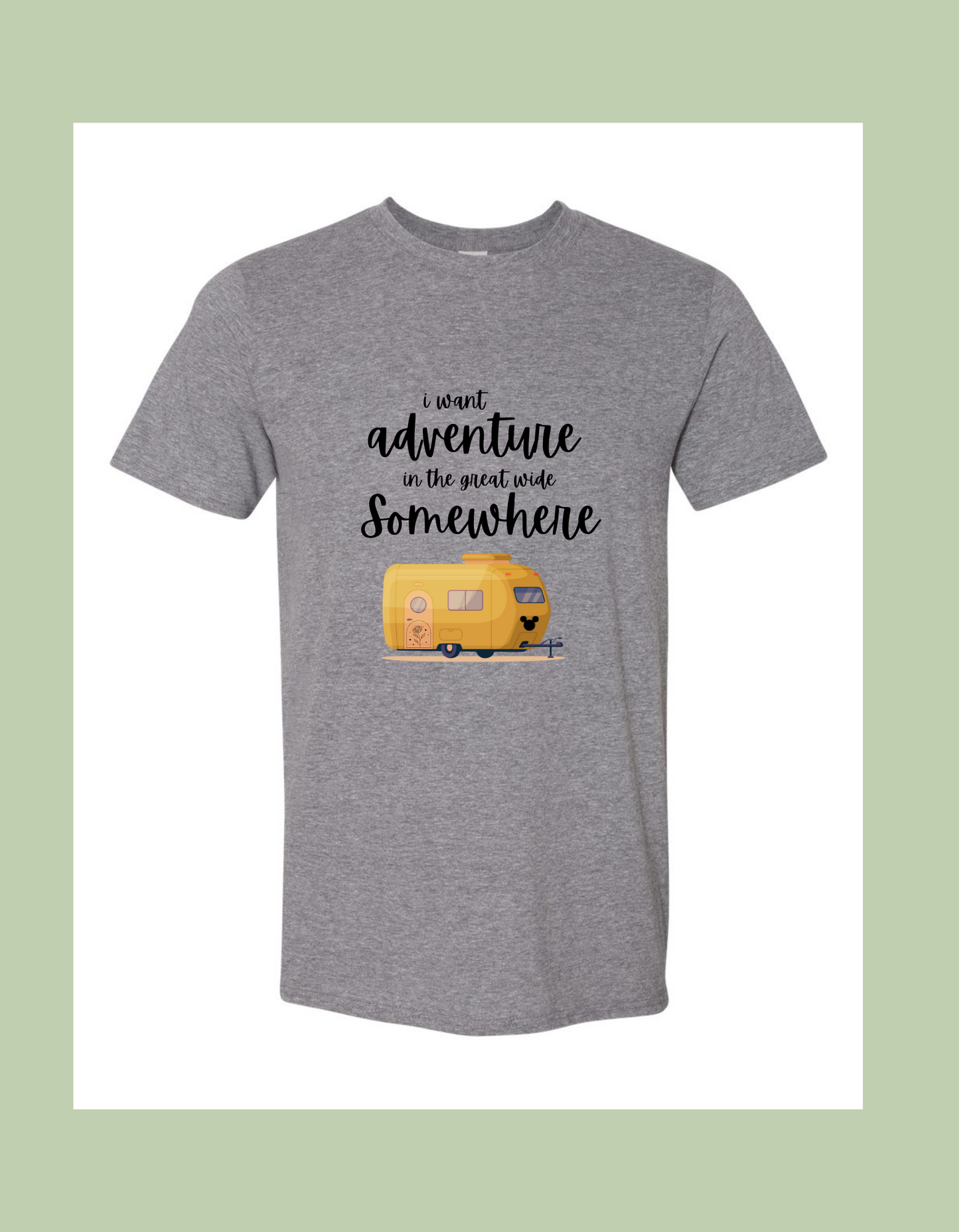 "I want adventure in the great wide somewhere" design on grey Gilden Softstyle 100% cotton t-shirt.