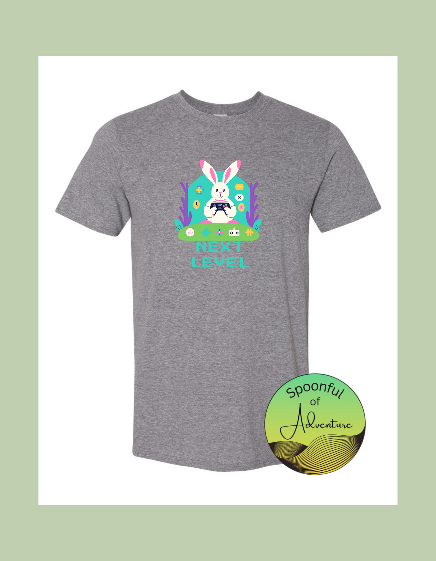 "Next Level" Gaming Easter Bunny on grey Gilden Softstyle 100% cotton t-shirt.