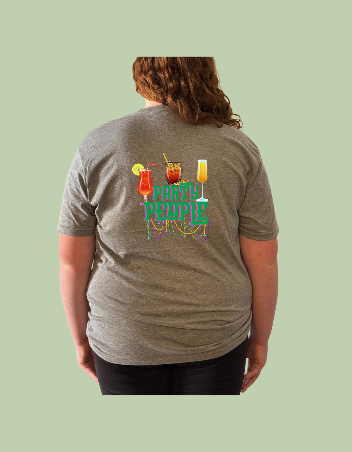 "Party People" Mardi Gras Beads and Drinks design on back of grey Gilden Softstyle 100% cotton t-shirt.