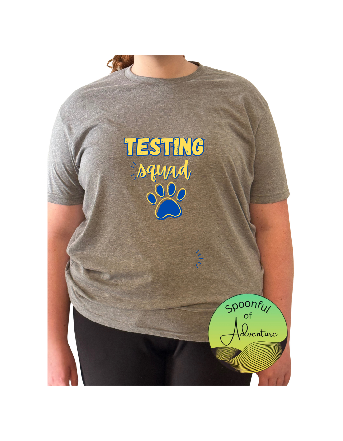 "Testing squad" design on grey Gilden Softstyle 100% cotton t-shirt. Please let us know your school colors and mascot so we can personalize.